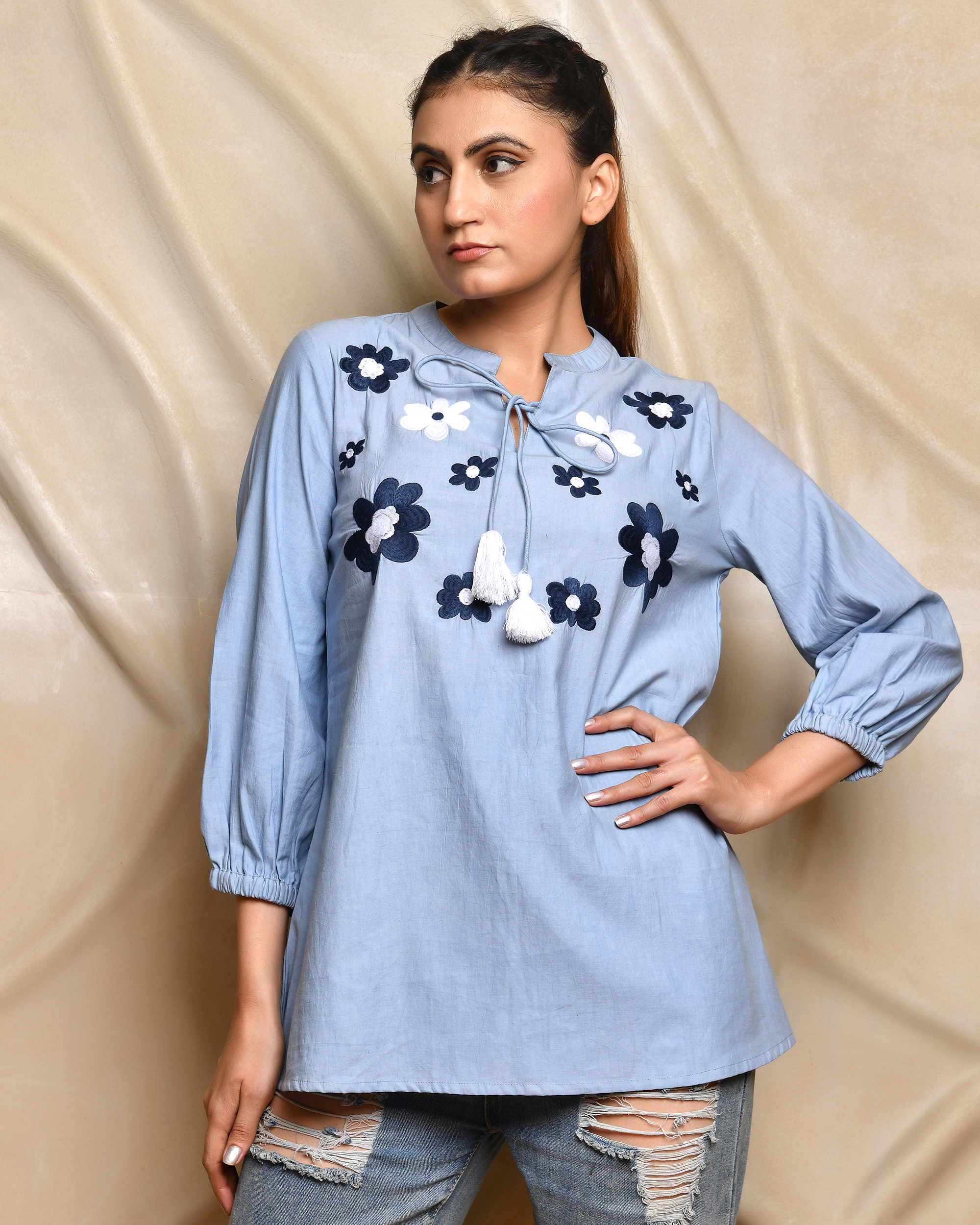 Add a playful charm to your casual wardrobe with this powder blue floral embroidered top. Featuring intricate white and navy blue floral embroidery across the yoke, this top brings a fresh, youthful vibe to your outfit. It has a relaxed fit with three-quarter elasticated sleeves and a tie-up neckline with tassels for a bohemian touch. Pair it with distressed denim or shorts for an easygoing, stylish look perfect for brunch or a day out.