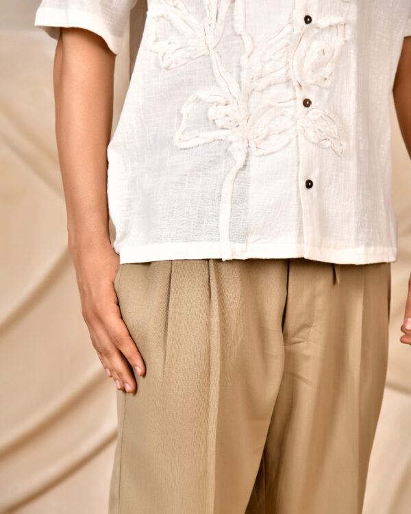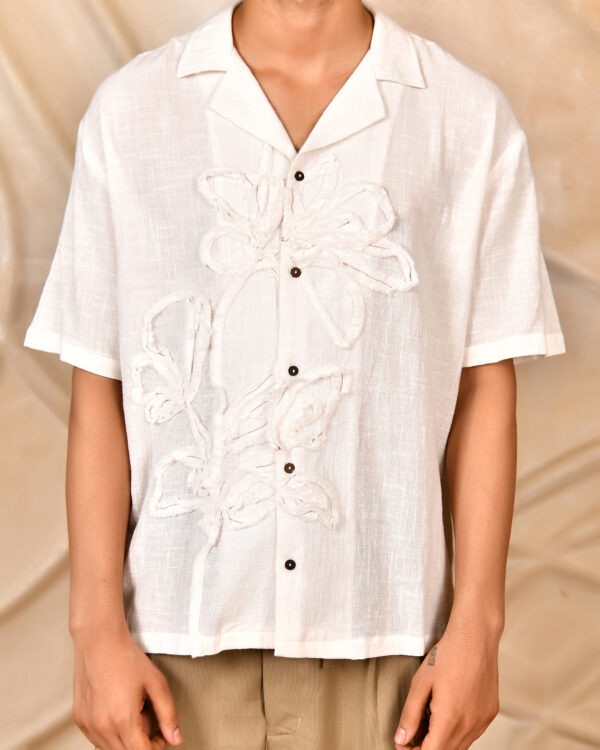 Elevate your summer wardrobe with this refined short-sleeve shirt, crafted from lightweight and breathable white fabric. Featuring an open-collar design and a relaxed fit, this shirt combines comfort with understated elegance. The standout detail is the oversized floral appliqué embroidery, which adds a handcrafted, textured touch to the front panel. With its clean finish, coconut-hued buttons, and casual structure, this piece is perfect for effortless warm-weather styling.