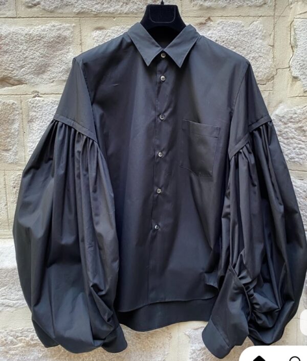 Make a bold statement with this oversized black shirt, tailored in a crisp cotton-blend fabric that exudes modern sophistication. Designed with a sharp collared neckline and front button placket, this piece stands out with its dramatic voluminous bishop sleeves, gathered from shoulder to cuff for a striking silhouette. A single patch pocket on the chest adds a subtle utilitarian detail, balancing the otherwise elegant, fashion-forward aesthetic. The structured yet breathable fabric offers a polished look while maintaining all-day comfort. Perfect for pairing with tailored trousers or elevating your casual wear, this shirt is a standout addition to any contemporary wardrobe.