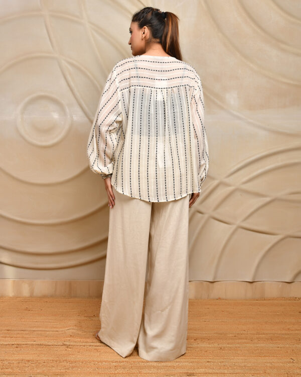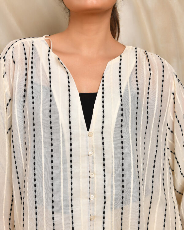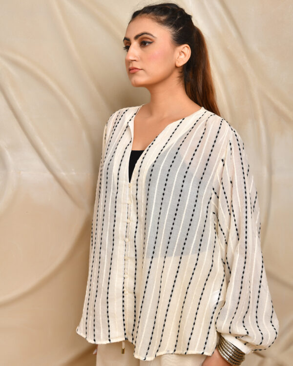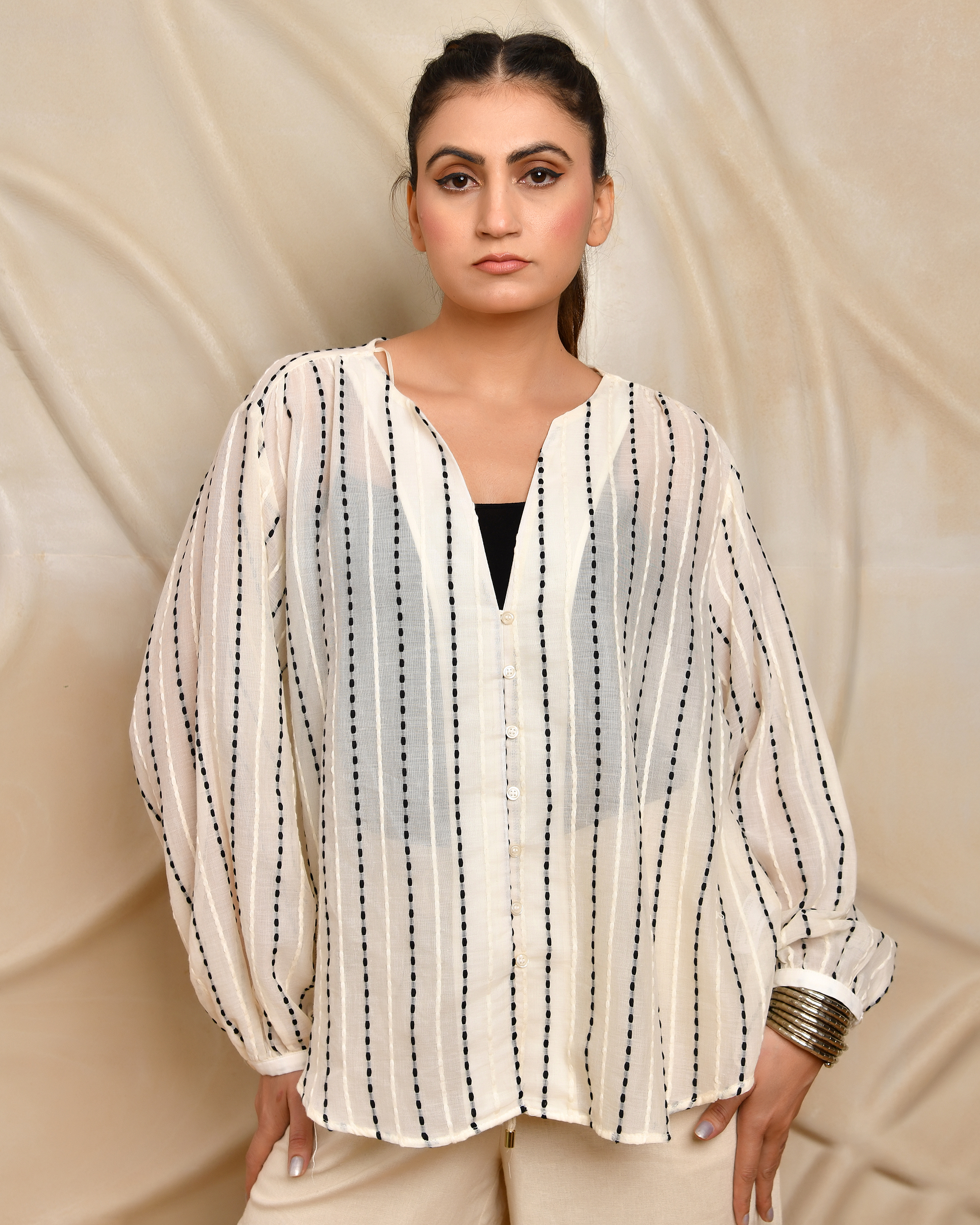 Effortlessly stylish and breathable, this ivory-white sheer blouse is adorned with vertical black dotted stripes, giving it a modern yet timeless appeal. The soft, flowy silhouette features full-length balloon sleeves gathered at the cuffs, a V-neckline with a modest button-down front, and a relaxed fit that drapes elegantly on the body. Whether paired with tailored trousers or casual denim, this blouse brings understated elegance to any look. A versatile wardrobe essential for both casual days and dressier evenings.