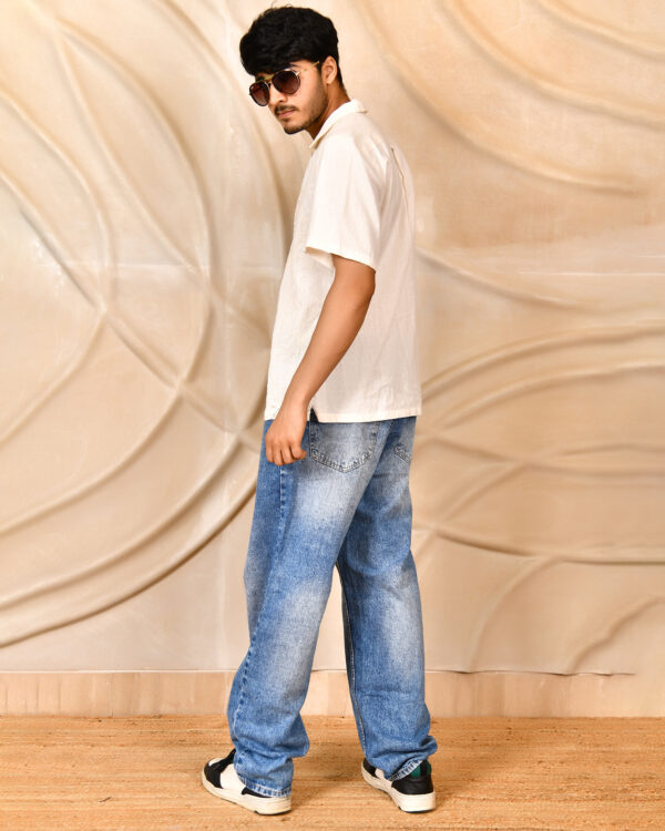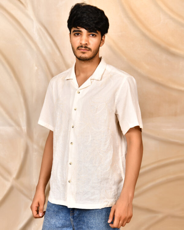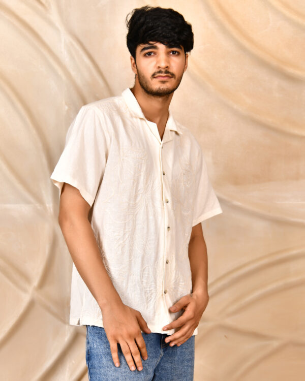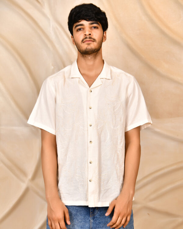 Elevate your summer wardrobe with this ivory short-sleeve shirt, crafted for effortless style and comfort. Featuring an open collar and relaxed silhouette, the shirt is adorned with subtle tonal floral embroidery that adds a refined texture without overwhelming the look. Lightweight and breathable, this shirt pairs perfectly with both casual and smart-casual outfits, making it a versatile choice for beach days, brunches, or vacation evenings. Its understated charm and elegant detailing offer a timeless appeal for the modern man.