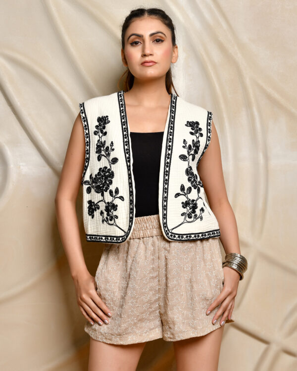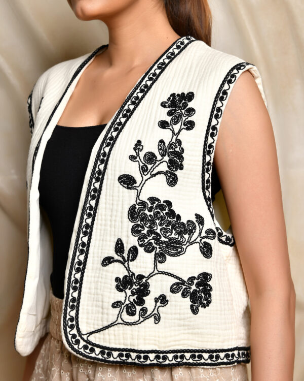 A sleeveless ivory cotton vest featuring rich black floral embroidery on the front.