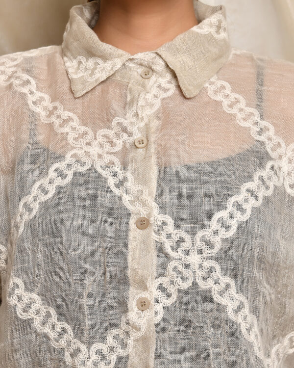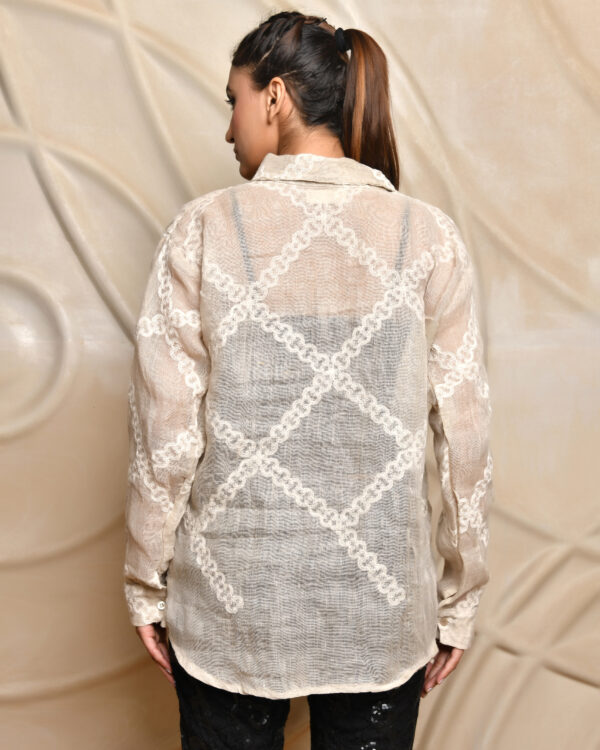 Add a delicate charm to your wardrobe with this sheer beige button-down shirt featuring intricate lacework. The crinkled texture gives it a casual yet refined appeal, while the embroidered diamond grid pattern enhances its feminine elegance. Designed with a collared neckline and full sleeves, this shirt pairs effortlessly with both tailored trousers and casual denim. Lightweight and breezy, it’s perfect for layering or wearing solo on warmer days — a chic statement piece with timeless appeal.