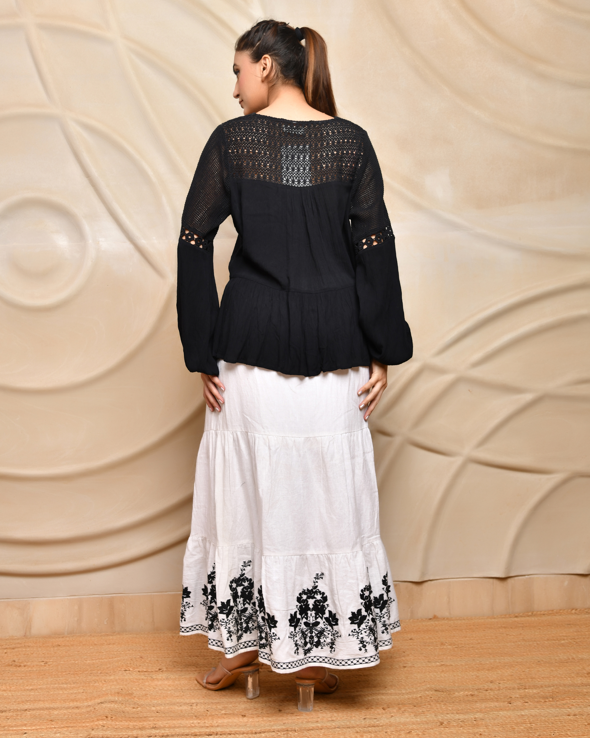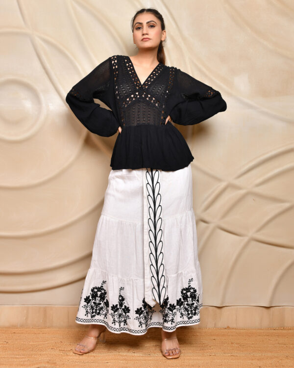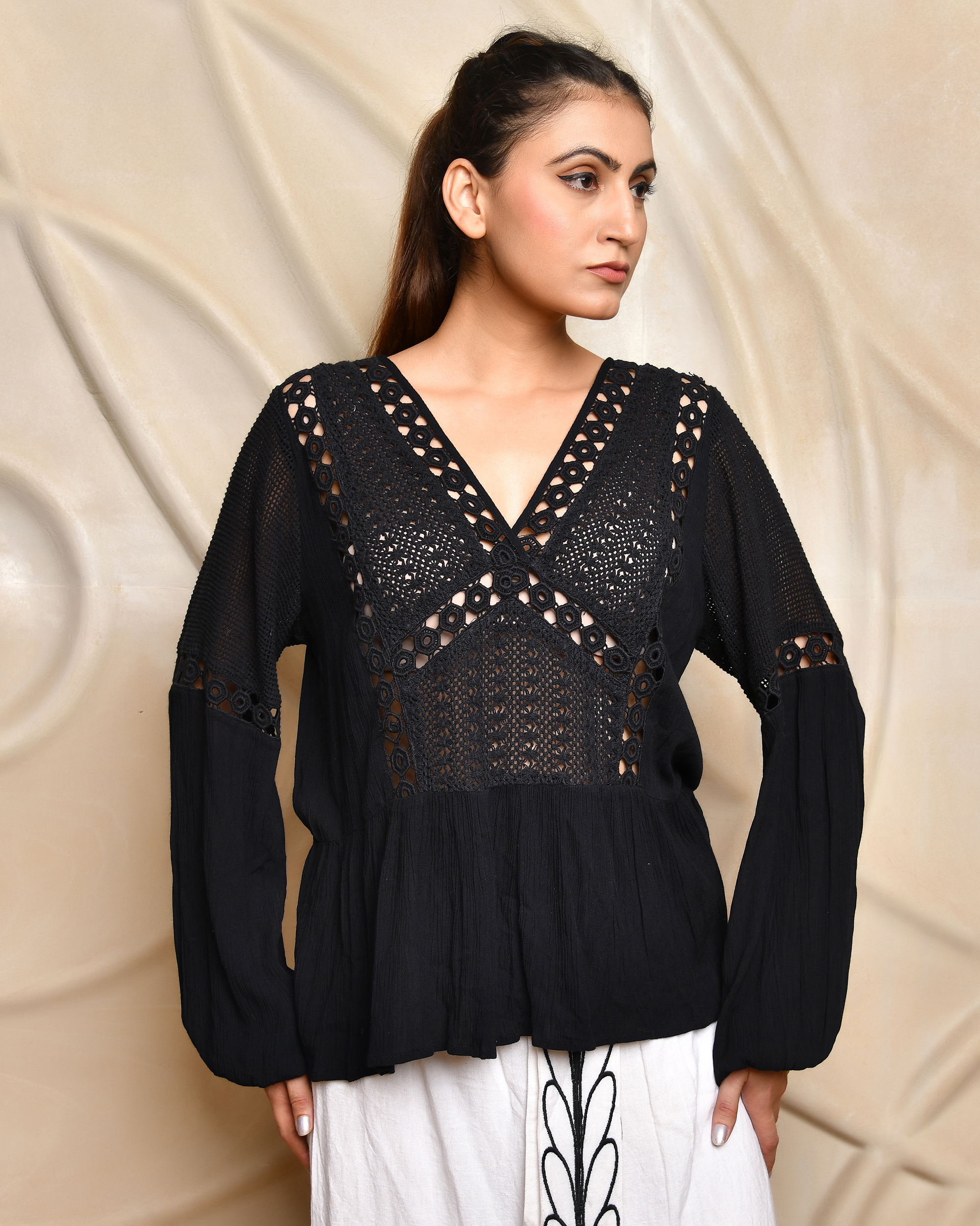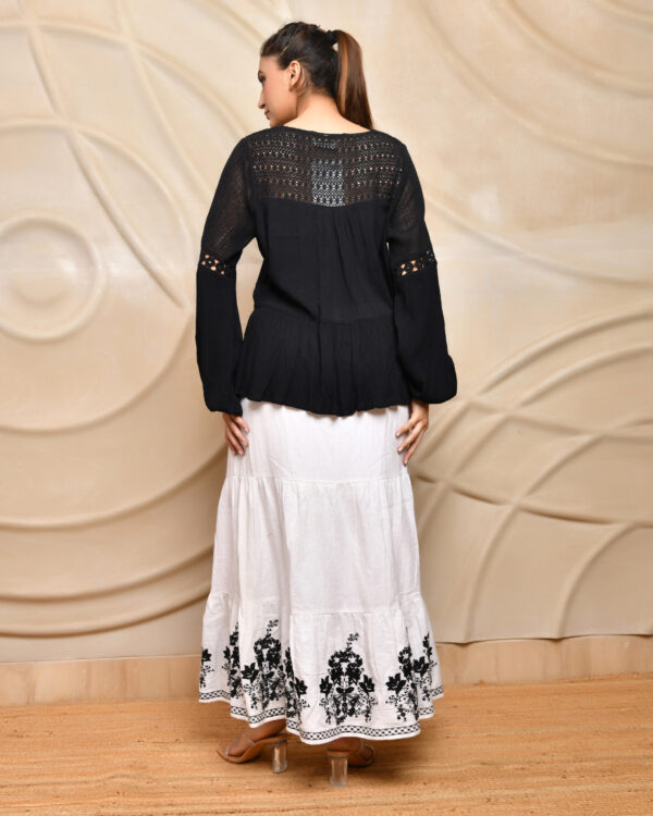 Elevate your style with this black crochet-detailed blouse featuring intricate cutwork and a flattering V-neckline. The handcrafted open-knit crochet panels are beautifully balanced with solid woven fabric at the waist and sleeves, creating a statement look that’s both bold and feminine. The peplum-style flare at the bottom adds a soft silhouette, while the long sleeves with gathered cuffs offer comfort with a touch of drama. Whether paired with classic trousers or breezy skirts, this top transitions effortlessly from day to evening.