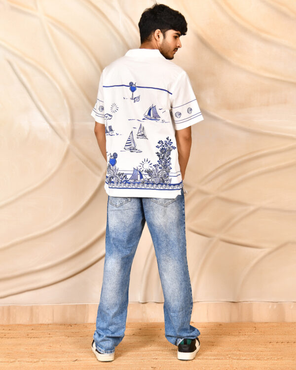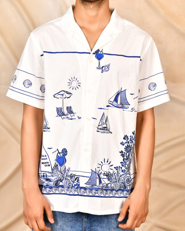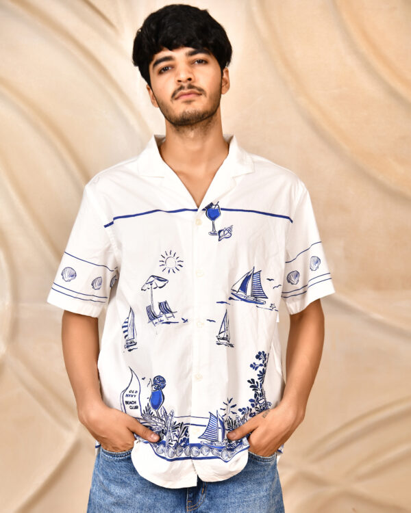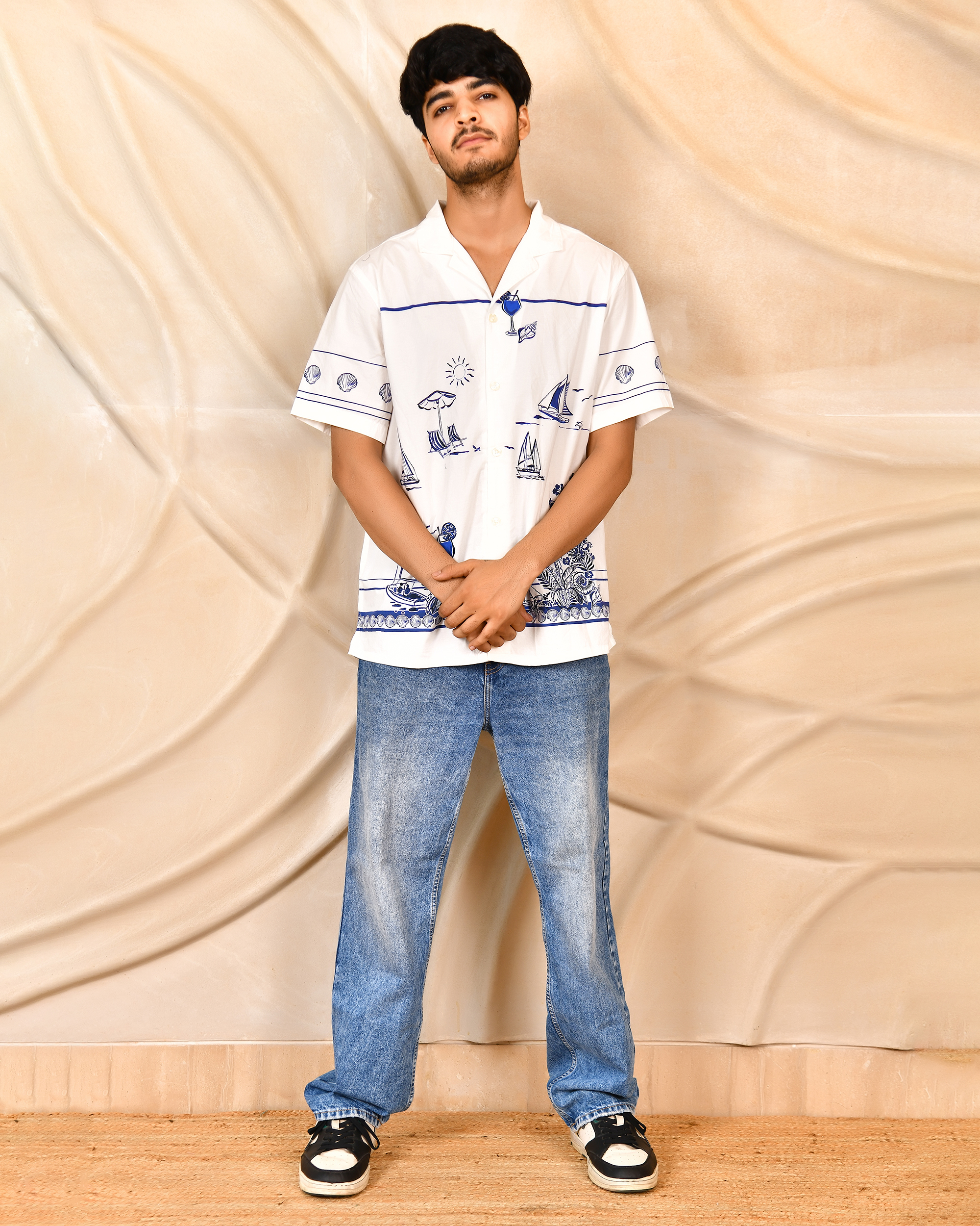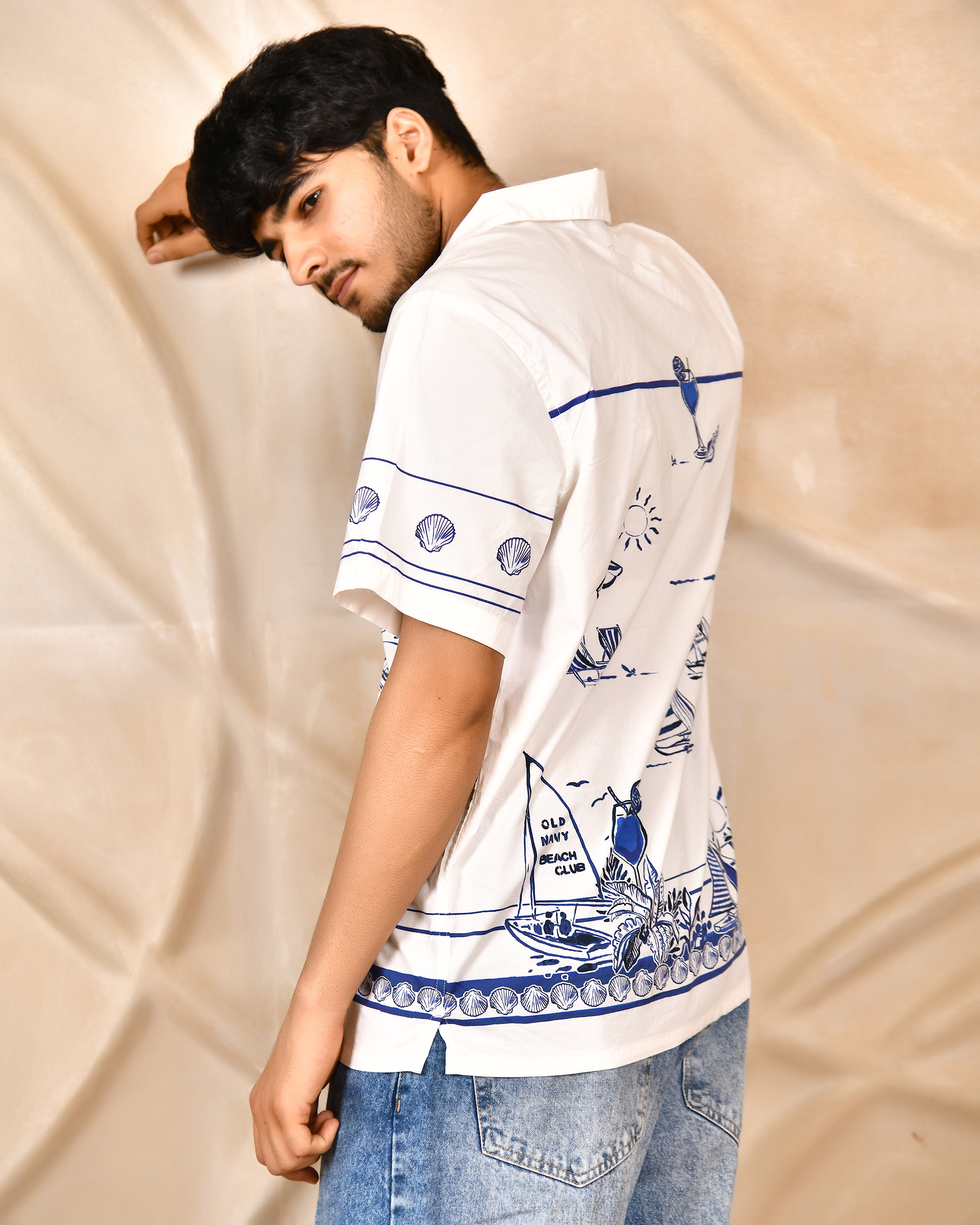 Step into vacation mode with this playful white Cuban-collar shirt featuring a bold blue beach-themed print. Adorned with sketches of sailboats, palm trees, cocktails, and sunny coastlines, this shirt exudes carefree summer vibes. The relaxed silhouette, short sleeves, and breezy fabric make it perfect for laid-back beach days, tropical getaways, or casual weekend outings. Whether you’re lounging at a beachside café or strolling through a resort town, this shirt brings a splash of fun to your wardrobe