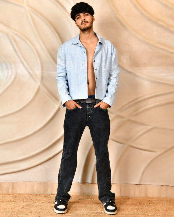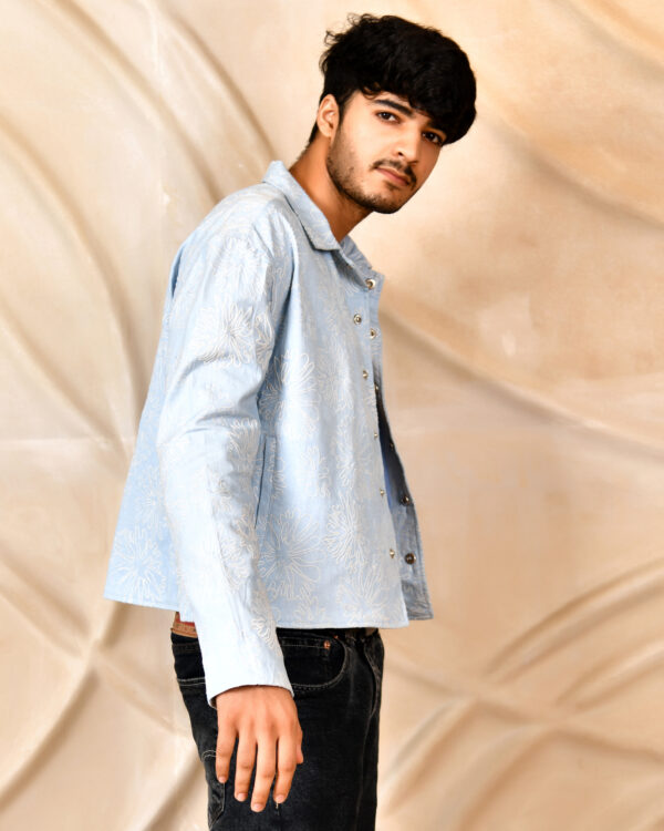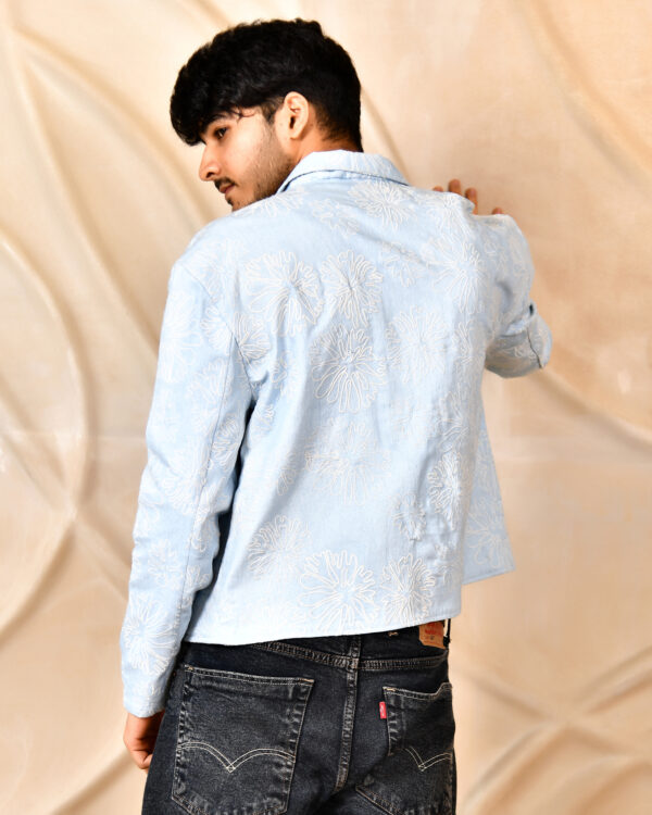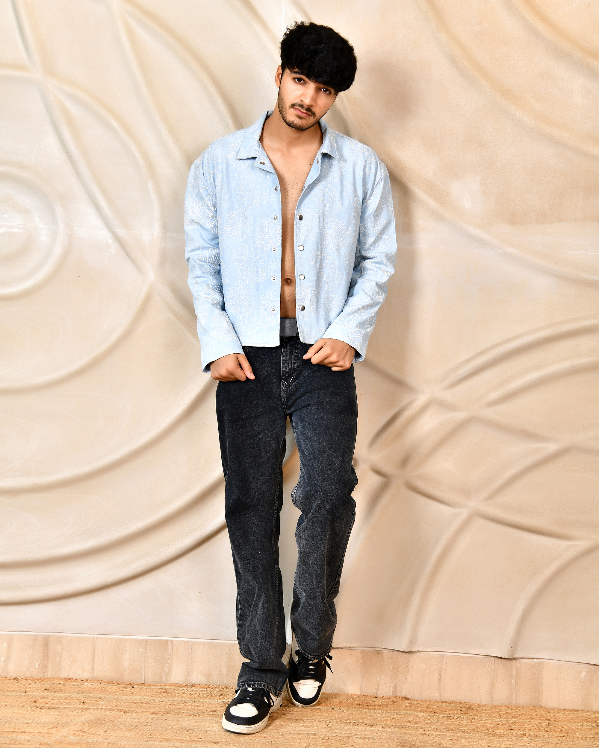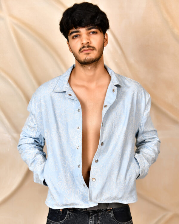 Elevate your casual style with this light blue denim shirt featuring intricate white embroidered floral patterns. The shirt is designed with a relaxed fit and snap-button closure, combining laid-back charm with artistic detail. Ideal for layering or wearing on its own, this piece is perfect for adding a creative edge to your everyday outfits.