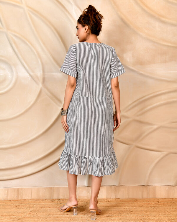 Step into effortless style with our Monochrome Striped V-Neck Midi Dress – the ultimate blend of comfort and casual sophistication. This easygoing silhouette features a flattering deep V-neckline, short cuffed sleeves, and an empire waist that flows into a relaxed, A-line structure. The vertical stripe pattern enhances the length while the flared ruffle hem adds a playful touch of movement. Complete with hidden side pockets for functionality, this midi dress is your go-to for relaxed weekends, casual outings, or travel days when style and ease are both a priority.
